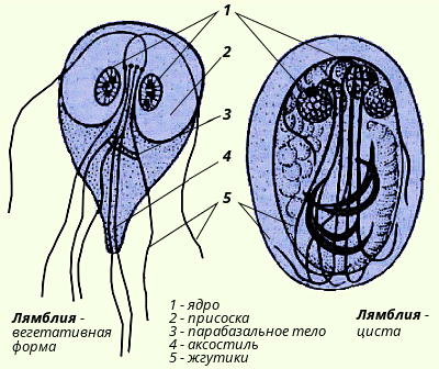 Морфофизиологическая характеристика. Характерная особенность лямблии - наличие двусторонней симметрии. Размер от 10 до 18 мкм. Тело грушевидной формы, разделенное продольно на правую и левую половины. Передний конец расширен и закруглен, задний сужен и заострен. Все органоиды и ядра парные. Между ядрами лежат 2 опорных стержня. В середине тела находятся ядра полулунной формы. С вентральной стороны тело плоское. Здесь расположен присасывательный диск, которым паразит прикрепляется к слизистой оболочке хозяина. Имеет 4 пары жгутиков. По средней линии тела проходят начальные нити (аксонемы) жгутиков. Питание осмотическое: растворенными веществами, накапливающимися в зоне пристеночного пищеварения. Жизненный цикл состоит из чередования вегетативных и инцистированных форм паразита. Вегетативная форма обитает в верхних отделах кишечника и попадая в нижние отделы кишечника она переходит в четырехядерные цисты, которые с фекалиями выносятся наружу и рассеиваются во внешней среде. Источником заражения служат немытые овощи, фрукты, некипяченая вода, грязные руки.