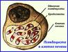 | Жизненный цикл токсоплазмы в организме промежуточного хозяина При заглатывании ооцисты или тканевой цисты при поедании плотоядными добычи, а человеком недоваренного мяса, в желудке промежуточного хозяина происходит их разрушение и выход спорозоитов и/или брадизоитов, которые проникают в клетки кишечного эпителия, где дифференцирутся в тахизоиты. Инвазировав макрофаги (моноциты) тахизоиты разносятся по всему организму гематогенным путем, заражая практически все виды клеток, где размножаются в паразитоформной вакуоли путем эндодиогении. Размножаясь исключительно внутриклеточно, тахизоиты довольно быстро исчерпывают резервы клетки и приводят к ее гибели, разрушению и высвобождению большого количества молодых тахизоитов. Молодые тахизоиты легко устраняются иммунной системой хозяина, однако часть из них при этом внедряется в новые клетки и трансформируется в брадизоиты с формированием тканевых цист (псевдоцист) – внутриклеточных скоплений токсоплазм, окруженных собственной оболочкой. Каждая псевдоциста содержит 5–10 тысяч (и более) брадизоитов, размеры ее зависят от возраста, типа клетки, в которой паразитирует возбудитель, штамма токсоплазм. Брадизоиты формируют псевдоцисты во многих тканях макроорганизма, однако чаще всего в нервной и мышечной (головной мозг, сердце, скелетная мускулатура, сетчатка глаза). Они очень устойчивы к различным воздействиям и в организме хозяина сохраняются десятки лет. Через плотную оболочку псевдоцист не проникают ни антитела, ни лекарственные препараты. Кроме того, если острая фаза происходит во время беременности, то паразит может проникнуть через плаценту и инфицировать плод (врожденная передача) |