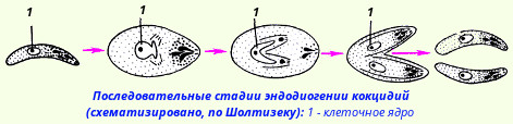 Для тахизоита характерно бесполое размножение путем эндодиогении - особой формы деления. При этой форме размножения формирование двух дочерних особей происходит внутри материнской. Закладка апикальных комплексов дочерних клеток (т.е. коноида, колец, роптрий, микронем и др.) происходит внутри материнской клетки одновременно с началом деления ядра. Пелликула дочерних клеток образуется за счет наружной мембраны материнской клетки, которая целиком переходит на дочерние особи.