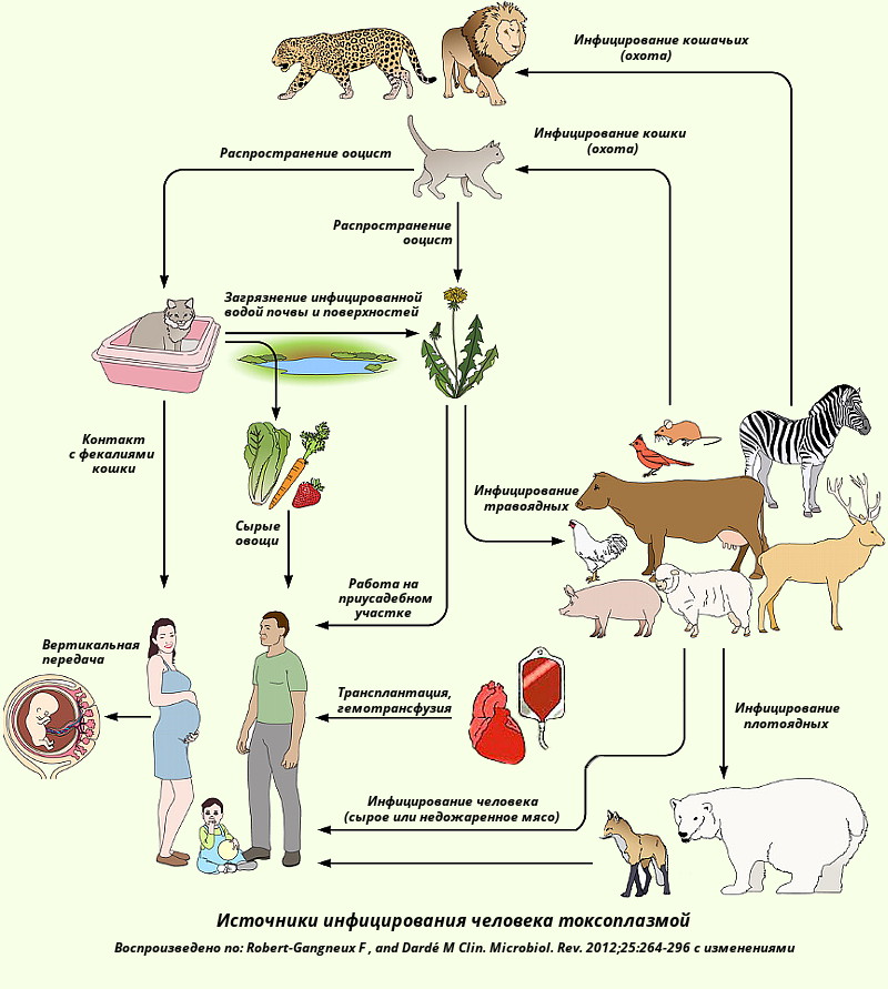 - Пероральный путь заражения: при употреблении в пищу недостаточно термически обработанного мяса и яиц от инвазированных токсоплазмами животных, а также при заглатывании ооцист со свежими овощами и фруктами, которые принято употреблять в пищу без термической обработки, употреблении непастеризованного (особенного козьего) молока и молочных продуктов, "сырой" воды, с другими продуктами, обсеменяемыми ооцистами с грязных рук после контакта с почвой, кошкой и ее лотком.