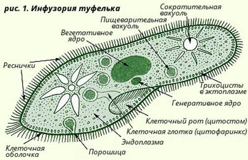 Инфузория туфелька обитает в мелких стоячих водоемах. Формой тeлa она напоминает подошву туфли, в длину достигает 0,1-0,3 мм, покрыта прочной эластичной оболочкой - пелликулой, под которой в экто- и эндоплазме находятся скелетные опорные нити. Такое строение позволяет инфузории сохранять постоянную форму тела.