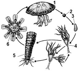 Медузы раздельнополы. Оплодотворение наружное – происходит в воде. Из зиготы (2) развивается личинка – планула (3). Через некоторое время, планула прикрепляется ко дну и превращается в одиночного полипа — сцифистому (4), который может размножаться как почкованием, так и отпочковывать молодых медуз – эфир (5, 6). Эфиры подрастают и превращаются во взрослых медуз (1).