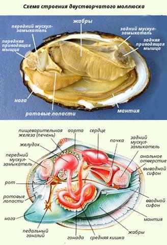 В задней части обе створки раковины и мантийные складки не прилегают плотно одна к другой, между ними остаются два отверстия - сифоны. Нижний, вводной, сифон служит для введения в мантийную полость воды. Беспрерывный направленный ток воды осуществляется благодаря движению многочисленных ресничек, которые покрывают поверхность туловища, мантии, жабр и других органов мантийной полости. Вода омывает жабры и обеспечивает газообмен, в ней же содержатся пищевые частицы. Через верхний, выводной, сифон использованная вода вместе с экскрементами выводится наружу.