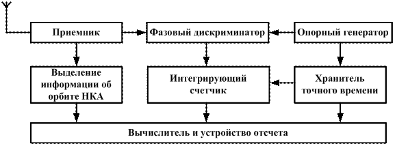Такое измерение можно осуществить по блок-схеме (рис. 23.5) путем непрерывного сравнения частоты колебаний, принимаемых от НКА, с частотой колебаний опорного генератора и интегрирования набега фазы за счет эффекта Доплера.