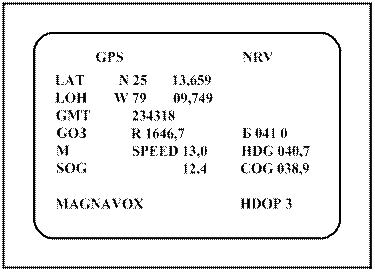 Вид информации на дисплее зависит от типа ПИ, но основными данными являются: ® Всемирное (Гринвичское) время ТГР; ® обсервованные координаты (j0, l0); ® геометрический фактор Г; ® путь судна ПУ; ® путевая скорость VПУ (рис. 23.11).