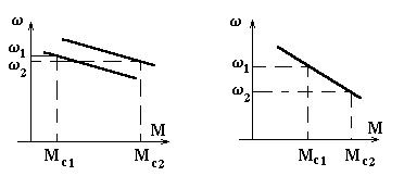 Понятие “регулирование скорости”, когда используются разные характеристики (рис. 7, а), не следует смешивать с изменением скорости, даже значительным, которое вызывается ростом или снижением нагрузки и происходит в соответствии с формой данной механической характеристики (рис. 7, б).