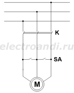 Можно обойтись и без конденсаторов, просто замкнув с помощью ключей SA, обмотку статора по схеме “звезда”, предварительно отключив ее от сети с помощью контактора K. Тогда торможение произойдет значительно быстрее, за счет остаточного магнетизма двигателя. Такое торможение еще называется магнитным торможением.