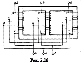 На рис. 2.18 показано соединение обмоток трехфазного трансформатора по схеме