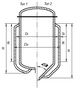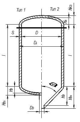 Рис. 5.1. Конструкція корпусів і стандартних нероз’ємних сорочок вертикальних стальних зварних апаратів; тип 1, з еліпсоїдним днищем і нижнім випуском продукту; тип 2, з конічним днищем