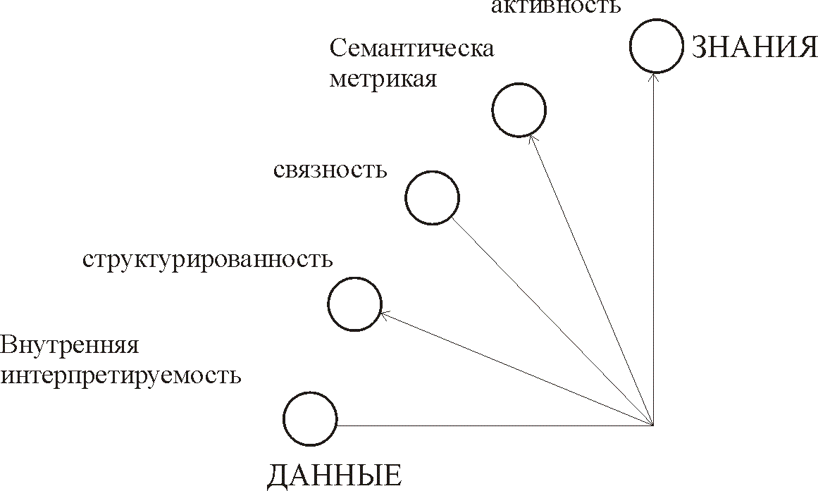 Важнейшими свойствами, присущими представлениям знаний в СППР [Еремеев А.П. Организация параллельных вычислений на основе моделей потока данных // Изв. РАН. Техн. кибернет., 1993, № 3, с. 212-225] являются внутренняя интерпретируемость, структурированность, связность, семантическая метрика, активность. Качественная диаграмма перехода от данных к знаниям представлена на рисунке 1.2. Перечисленные пять свойств информационных единиц - знаний - определяют ту грань, за которой данные превращаются в знания, а базы данных - в базы знаний. Совокупность средств, обеспечивающих работу с знаниями, образуют систему управления базой знаний (СУБЗ). В настоящее время не существует баз знаний, в которых в полной мере были реализованы внутренняя интерпретируемость, структуризация, связность, введена семантическая мера и обеспечена активность знаний.