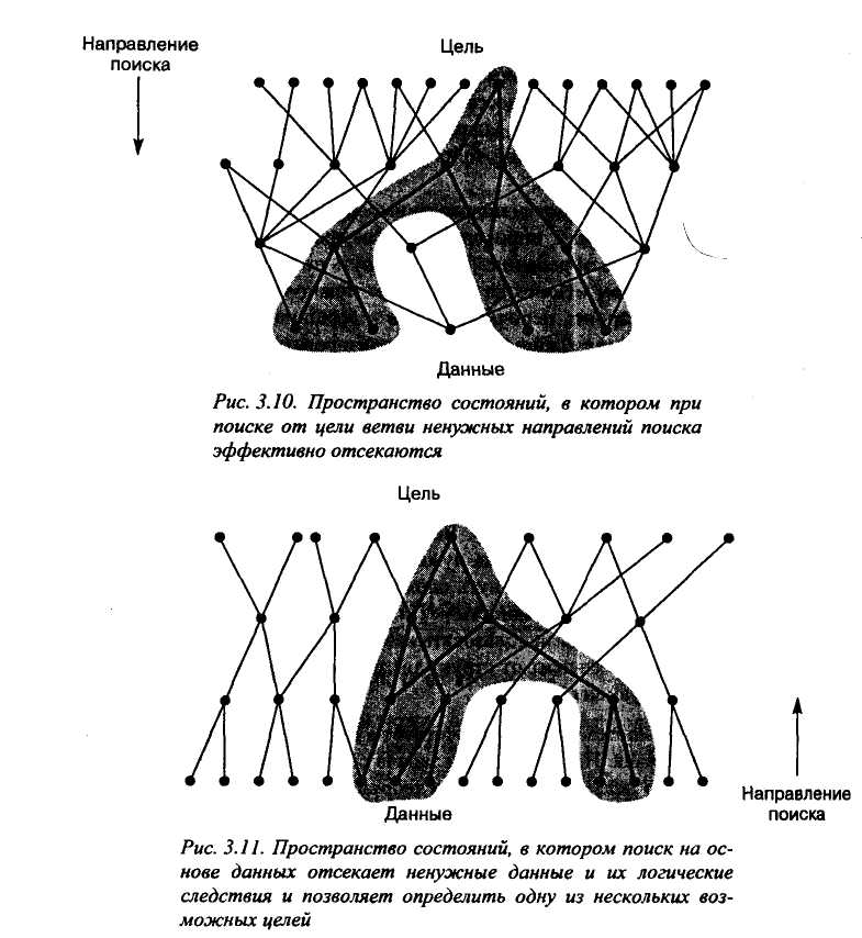 При поиске от данных процесс решения задачи начинается от заданного начального состояния и состоит в применении правил преобразования состояний задачи, которые, в свою очередь, используются для генерации новых состояний. Этот процесс продолжается до тех пор, пока не будет достигнуто целевое состояние. Возможен и другой подход. Целевое состояние рассматривается как потенциально достижимое, но путь кнему неизвестен. Для восстановления пути от целевого состояния к начальному состоянию анализируются допустимые правила преобразования, ведущие к цели. Эти новые состояния становятся новыми подцелями поиска. Поиск ведется в обратном направлении от достигнутых подцелей до достижения начального состояния. Таким образом, определяется путь от цели к исходным данных. Иногда поиск от цели, восстанавливающий путь в обратном порядке называют обратным поиском.