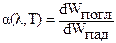 Способность тел поглощать падающее на них излучение характеризуется спектральной поглощательной способностью (или коэффициентом поглощения), которая показывает, какая доля энергии, приносимая за единицу времени на единицу площади поверхности тела падающими на нее электромагнитными волнами с длиной волны от l до l+dl, поглощается телом.