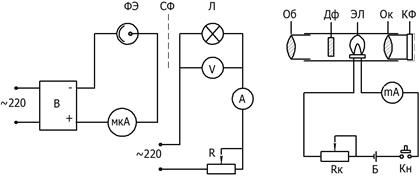 2) фотоэлемент ФЭ, микроамперметр мкА, подключенные к высоковольтному выпрямителю В;