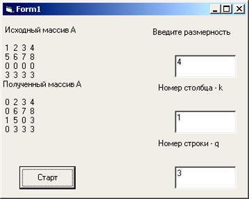 Разработать информационную технологию, позволяющую поменять местами элементы k-го столбца и q-й строки квадратной матрицы А произвольной размерности m×m.