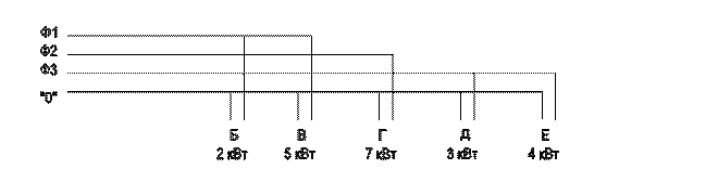 где Рб..Ре - мощность потребителей Б…Е. Для наглядности целесообразно нарисовать схему, поясняющую распределение потребителей по фазам. Например, при мощностях потребителей Б,В,Г,Д,Е, соответственно равных 2,5,7,3,4 кВт, Рср =7 кВт и схема будет выглядеть