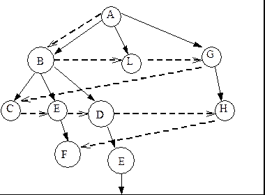 Стратегия поиска в ширину предусматривает переход в первую очередь к вершинам, ближайшим к стартовой вершине (т.е. отстающим от нее на одну связь), затем к вершинам, отстающим на две связи, затем на три и т. д., пока не будет найдена целевая вершина (рис. 5).