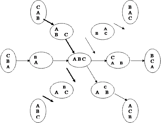 Проблемные ситуации вместе с возможными ходами образуют направленный граф, называемый пространством состояний. Пространство состояний для этой простейшей задачи может быть изображено в виде полного графа представления задачи манипулирования кубиками (рис. 8).