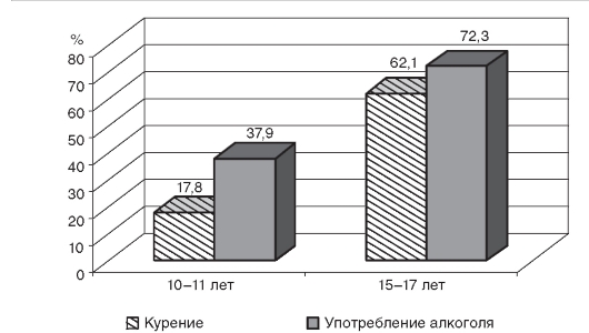 По мнению А.М. Митяевой курение подростков, в первую очередь, сказывается на нервной и сердечной - сосудистой системах. В 12-15 лет они уже жалуются на отдышку при физической нагрузке. Курение школьников замедляет их физическое и психическое развитие. Алкоголь так же негативно влияет на подростков[11].