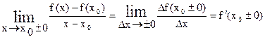 Правой (левой) производной функции f(x) в точке x 0 называется предел справа (слева) отношения приращения функции к приращению аргумента при стремлении последнего к нулю