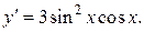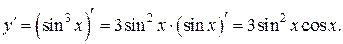 Найдем производную степени (таблица производных): это показатель степени, умноженный на то, что в степень возводится, в степени на единицу меньше. Поскольку в степень возводится функция, зависящая от x, необходимо предыдущий результат умножить на производную sin x (формула 6). Таким образом, получим: