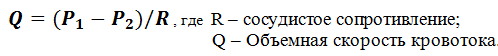 Это основной закон гемодинамики: количество крови, протекающей через поперечное сечение сосуда в единицу времени, прямо пропорционально разности давления в начале и в конце сосуда и обратно пропорционально его сопротивлению.