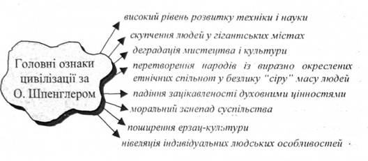 О.Шпенглер розглядав цивілізацію як стадію занепаду певної культури, оскільки для цивілізації гонитва за нескінченним нарощуванням матеріальних ресурсів суспільного життя стає провідним чинником її дії. Після книги О. Шпенглера "Занепад Європи" проблема взаємозв'язку культури та цивілізації стає визнаною і надзвичайно актуальною. Коментуючи цей твір німецького культуролога, російський філософ М. Бердяєв зазначав, що культурою рухає безкорисне прагнення самореалізації, а цивілізацією — саме користь, матеріальні зацікавлення. Тому цивілізація знищує культуру, веде до втрати нею своїх живильних імпульсів; на місце культури як прагнення до людського самовиявлення на рівні виходу на абсолюти, священне, приходить псевдокультура, заснована на неконтрольованих вибухах негативної енергії.