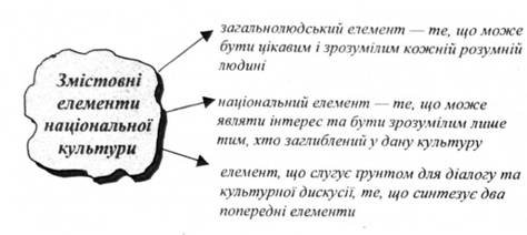 У зв'язку з цим у змісті кожної національної культури умовно можна виділити кілька її змістовних елементів.