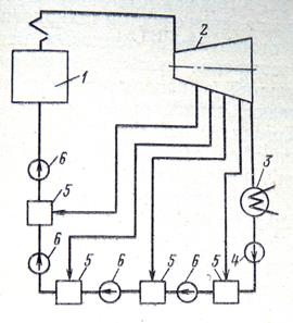 1 – парогенератор; 2 – турбина; 3 – конденсатор; 4 – конденсатный насос; 5 – смешивающий подогреватель, 6 – перекачивающий насос.
