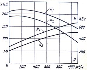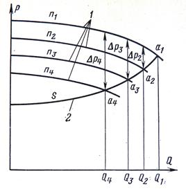 Рисунок 14.3-График регулирования центробежной машины изменением частоты вращения.1 – характеристика машины; 2 – характеристика сети