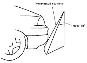 Под линией пола подразумевается теоретическая линия, образованная как геометрический след от точек контакта конуса, имеющего половинный угол при вершине равный 30°, с наружной поверхностью транспортного средства (рисунок 3.1). Выступающие домкратные гнезда, выхлопные трубы и колеса не учитываются, а колесные ниши считаются заполненными и включенными в объем кузова. Выпускная труба, расположенная сбоку, может представлять точку контакта, которая определит линию пола.
