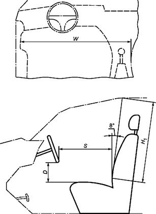 | Минимальная ширина W Минимальное расстояние по вертикали между нижней кромкой рулевого колеса и верхней передней кромкой подушки сиденья D | Заданное изготовителем базового автомобиля эргономичное свободное пространство не должно уменьшаться | |