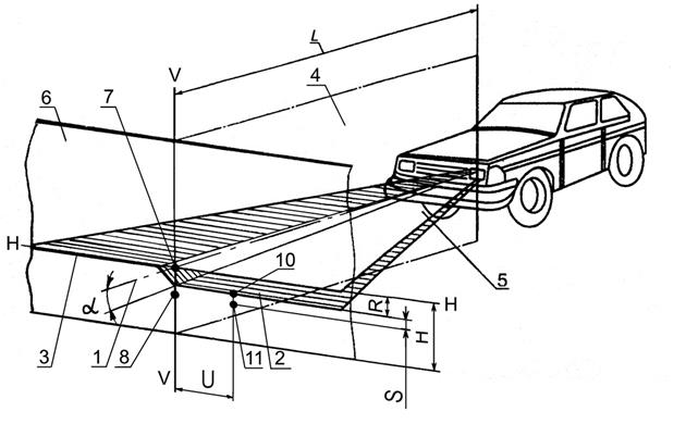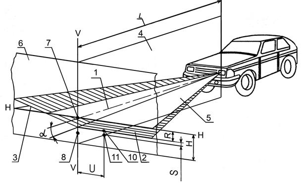 4 - вертикальная плоскость, проходящая через ось отсчета; 5 - плоскость, параллельная плоскости рабочей площадки, на которой установлено транспортное средство; 6 - плоскость матового экрана; α - угол наклона светового пучка к горизонтальной плоскости; L - расстояние от оптического центра фары до экрана; 7 - положение контрольной точки для измерения силы света в направлении оси отсчета светового прибора); 8 - положение контрольной точки для измерения силы света в режиме "ближний свет" в направлении линии, расположенной в одной вертикальной плоскости с оптической осью прибора для проверки и регулировки фар, и направленной под углом 52′ ниже горизонтальной части светотеневой границы светового пучка ближнего света;