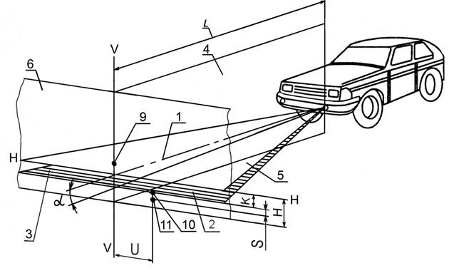 9 - положение контрольной точки для измерения силы света противотуманных фар в направлении 3° вверх; 10, 11 - координаты точек для измерения положения светотеневой границы в вертикальной плоскости; R - расстояние по экрану от проекции оптического центра фары до положения горизонтальной (левой) части светотеневой границы; К - расстояние по экрану от проекции оптического центра фары до положения светотеневой границы пучка света противотуманной фары; Н - расстояние от проекции оптического центра фары до плоскости рабочей площадки; U, S - координаты точек измерения положения светотеневой границы в горизонтальной и вертикальной плоскостях соответственно