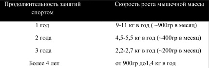 Исходя из этой зависимости, можно видеть, что прирост мышечной массы составляет примерно 1 кг в месяц или 250 гр в неделю, конечно, это не очень быстрый темп. Но прибавляя по 1 кг в месяц, в конечном итоге это составит 12 кг мышечной массы за год. Безусловно, оказывая влияние одним, или несколькими вышеуказанными факторами можно повлиять на темпы прироста мышечной массы соответственно вверх, или вниз. Значения, указанные в данной таблице применимы только для мужчин. Для женщин автор рекомендует использовать примерно половину этих значений. Например, в первый год занятий прирост мышечной массы для женщин ориентировочно составит 5-6 кг.