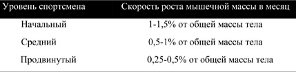 Из таблицы видно, что начинающий заниматься физическими нагрузками новичок весом примерно 60 кг может наращивать от 600гр до 900гр мышечной массы в месяц (7-11 кг в год), при условии правильно составленной программы занятий и питания. Через год его вес будет составлять где-то 70кг, и он будет способен набирать 350гр – 700гр в месяц (4кг-8кг в год). Еще через год упорных тренировок и правильного питания он будет весить примерно 77кг, и будет относиться к продвинутой категории спортсменов. С этого момента он может получить только 250-450гр прироста мышечной массы ежемесячно. Таким образом, чем дальше вы продвигаетесь, тем ниже будет скорость роста мышц.