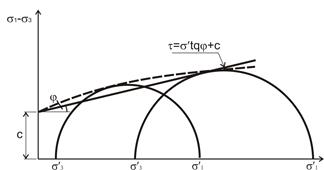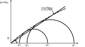 Используя результаты нескольких испытаний при различном всестороннем давлении можно построить круги Мора, касательная к которым является огибающей предельного равновесия Мора-Кулона. Результаты построений