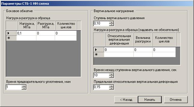 · Время предварительного уплотнения. На каждой ступени после создания боковой нагрузки происходит ожидание предварительного уплотнения образца. Необходимо задать время предварительного уплотнения. При циклической нагрузке-разгрузке время предварительного уплотнения ожидается и после нагрузки, и после разгрузки образца.