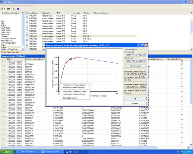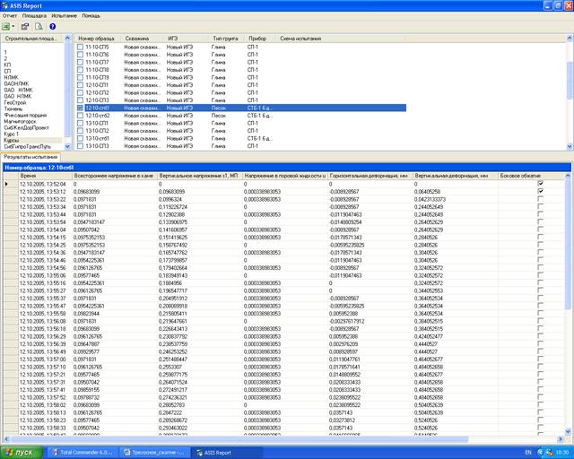 1. Запустите программу ASIS Report и выберите из базы данных испытаний необходимую строительную площадку и номер образца грунта.