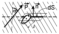 Рис. 5.3 | Элемент поверхности dS пересечет все те диполи, центры которых расположены в прилегающем к нему слое толщины l |cos α|, где α - угол между нормалью к dS и направлением вектора поляризованности (рис. 5.3). Объем этого слоя равен l |cos α| dS, а число пересекаемых элементом dS диполей равно n l |cos α| dS. |