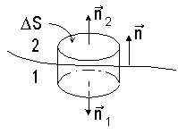 Рис. 5.4 | Рассмотрим границу раздела двух однородных изотропных диэлектриков 1 и 2 (рис. 5.4). Выделим мысленно на границе раздела цилиндр с площадью основания Δ S с образующей, перпендикулярной границе раздела. Выберем произвольно направление нормали nк границе,как показано на рисунке. Пусть площадка Δ S, вырезаемая цилиндром на границе,столь мала, что ее можно считать плоской, а поляризованность каждого из диэлектриков в ее пределах постоянной. |