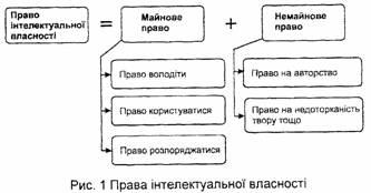 Таким чином, право інтелектуальної власності є сумою тріади майнових прав (права володіти, права користуватися, права розпоряджатися) та немайнових прав (право на авторство, право на недоторканість твору тощо) (рис.1).