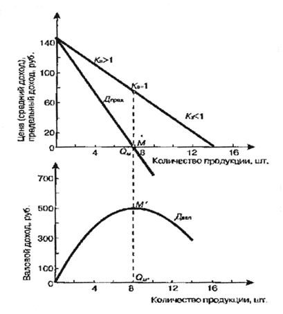 Кривая предельного дохода (Дпред) на рис. пересекает горизонтальную линию в точке М, в которой он равен нулю. В то же время валовой доход (Двал) при данном значении предельного дохода достигает максимума в точке М′, а затем при отрицательных значениях предельного дохода (та часть кривой предельного дохода, которая расположена ниже горизонтальной линии) начинает сокращаться. Это связано с тем, что предельный доход представляет собой изменения в валовом доходе. Как только эти изменения приобретают отрицательные значения, валовой доход начинает сокращаться. Таким образом, объему выпуска продукции, равному 8 ед. (Qм и Qм), соответствует максимальная величина валового дохода и нулевое значение предельного дохода.