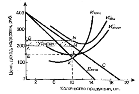 Рисунок 21.4 иллюстрирует рассматриваемую ситуацию. Линия спроса (С) лежит ниже кривой средних общих издержек () на всем своем протяжении. Монополист оказался в такой ситуации, когда линия спроса временно сместилась влево. Объем выпуска продукции, соответствующий минимуму убытков (как и максимуму прибыли), находится путем поиска точки пересечения кривых предельных издержек (Ипред.) и предельного дохода (Дпред) — точки К, которой соответствует 10 ед. продукции. Такое количество продукции может быть продано по цене 200 руб. за штуку. Однако средние общие издержки при этой величине выпуска равны 230 руб. Совокупный убыток показан заштрихованным прямоугольником. От реализации каждой единицы продукции предприятие терпит убыток, равный 30 руб. Следовательно, продажа 10 изделий увеличивает его в 10 раз — площадь прямоугольника MABN.