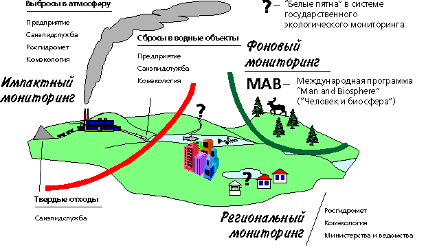 В области регионального мониторинга наблюдения ведутся в основном Росгидрометом, имеющим разветвленную сеть, а также некоторыми ведомствами (агрохимслужба Минсельхозпрода, водно-канализационная служба и др.) И, наконец, существует сеть фонового мониторинга, осуществляемого в рамках программы MAB (Man and Biosphere[3]).