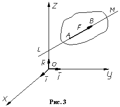 Действие силы на реальное физическое тело, которое деформируется силой, определяется: 1) величиной или модулем силы; 2) направлением силы; 3) точкой приложения силы. То есть сила, приложенная к физическому телу, является связанным вектором, который нельзя перемещать внутри физического тела. Само же физическое тело и вместе с ним сила могут перемещаться в пространстве. На рис. 3 показана сила, приложенная в точке A. Длина отрезка AB в определенном масштабе равна модулю силы. Точка B называется концом вектора силы. Стрелка на конце вектора указывает направление силы. Прямая LM, на которой лежит вектор силы, называется линией действия силы.