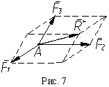в одной плоскости (рис. 6), можно построить параллелограмм, в котором диагональ изображает равнодействующую, а стороны изображают две составляющие. Аналогичное построение можно сделать в пространстве, разложив силу по трем направлениям, не лежащим в одной плоскости, как показано на рис. 7.