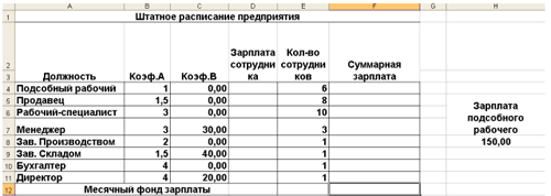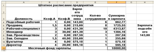 В ячейке F12 вычислите суммарный фонд заработной платы предприятия.