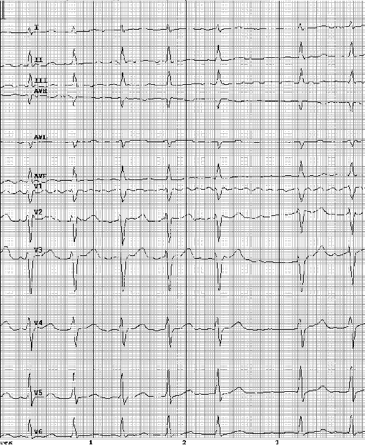 ЖЖЖ = 124 минутына. Эл. осі 82°- вертикальды. QRS = 0,091 с. Q−T = 0,317 с. Жүрекшенің фибрилляциясы, тахисистоликалық түрде. Вольтаж қанағаттанарлық. Жүректің электрлік осінің вертикальды қалпы.