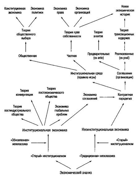 В последние десятилетия растет интерес к институциональной теории вообще и к ее неоинституциональному направлению в особенности. Отчасти это связано с попытками преодолеть ограниченность ряда предпосылок, характерных для экономике (аксиомы полной рациональности, абсолютной информированности, совершенной конкуренции, установления равновесия лишь посредством ценового механизма и др.), и рассмотреть современные экономические (и не только экономические!) процессы комплексно и всесторонне, отчасти — с необходимостью исследования новых явлений эпохи НТР, когда применение традиционных методов анализа не дает желаемого результата. Современный институционализм возник не на пустом месте. У неоинституционалистов были предшественники — представители «старого», традиционного институционализма, которые также пытались наладить связи между экономической теорией и правом, социологией, политологией и т.д. Однако между взглядами «старых» институционалистов (Т. Веблен, Дж. Коммонс, У. Митчелл) и неоинституционалистов есть по крайней мере три коренных различия. Во-первых, «старые» институционалисты (в частности, Дж. Ком-монс в «Правовых основах капитализма») двигались от права и политики к экономике, пытаясь подойти к анализу проблем современной экономической теории при помощи методов других наук об обществе. Неоинституционалисты идут прямо противоположным путем — изучают политологические, правовые и многие другие проблемы общественных наук при помощи методов неоклассической экономической теории и прежде всего с применением аппарата современной микроэкономики и теории игр. Во-вторых, «старый» институционализм базировался прежде всего на индуктивном методе, шел от частных случаев к обобще ниям, в результате чего общая институциональная теория так и не сложилась. Институты здесь анализировались без общей теории, в то время как ситуация с основным течением экономической мысли была, скорее, обратной: традиционная неоклассика была теорией без институтов. В современном институционализме положение коренным образом меняется: неоинституционализм использует дедуктивный метод — от общих принципов неоклассической экономической теории к объяснению конкретных явлений общественной жизни. Здесь сделана попытка анализировать институты на базе единой теории и внутри нее. В-третьих, «старый» институционализм как течение радикальной экономической мысли преимущественно обращал внимание на действия коллективов (в первую очередь профсоюзов и правительства) по защите интересов индивида; неоинституционализм ставит во главу угла независимого индивида, который сам, по своей воле и в соответствии со своими интересами решает, членом каких коллективов ему выгоднее быть.Единая классификация институциональных теорий до сих пор так и не сложилась. В этой связи безусловный интерес представляет классификация, предложенная А. Олейником. Она пытается учесть многообразие современных подходов и взаимосвязи между некоторыми из них. Однако при таком подходе вольно или невольно преуменьшается значение современной экономики соглашений и напрямую связываются противоположности: конституционная экономика и «старый» институционализм. К тому же обедняется содержание и «старого» институционализма: из него вырастают только экономика соглаш