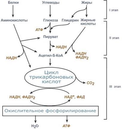 II этап – внутриклеточный катаболизм- глюкоза, высшие жирные кислоты, аминокислоты подвергаются специфическим превращениям до образования ацетил-КоА (гликолиз, β-окисление высших жирных кислот, трансаминирование аминокислот и др.)- процессы протекают в цитоплазме.